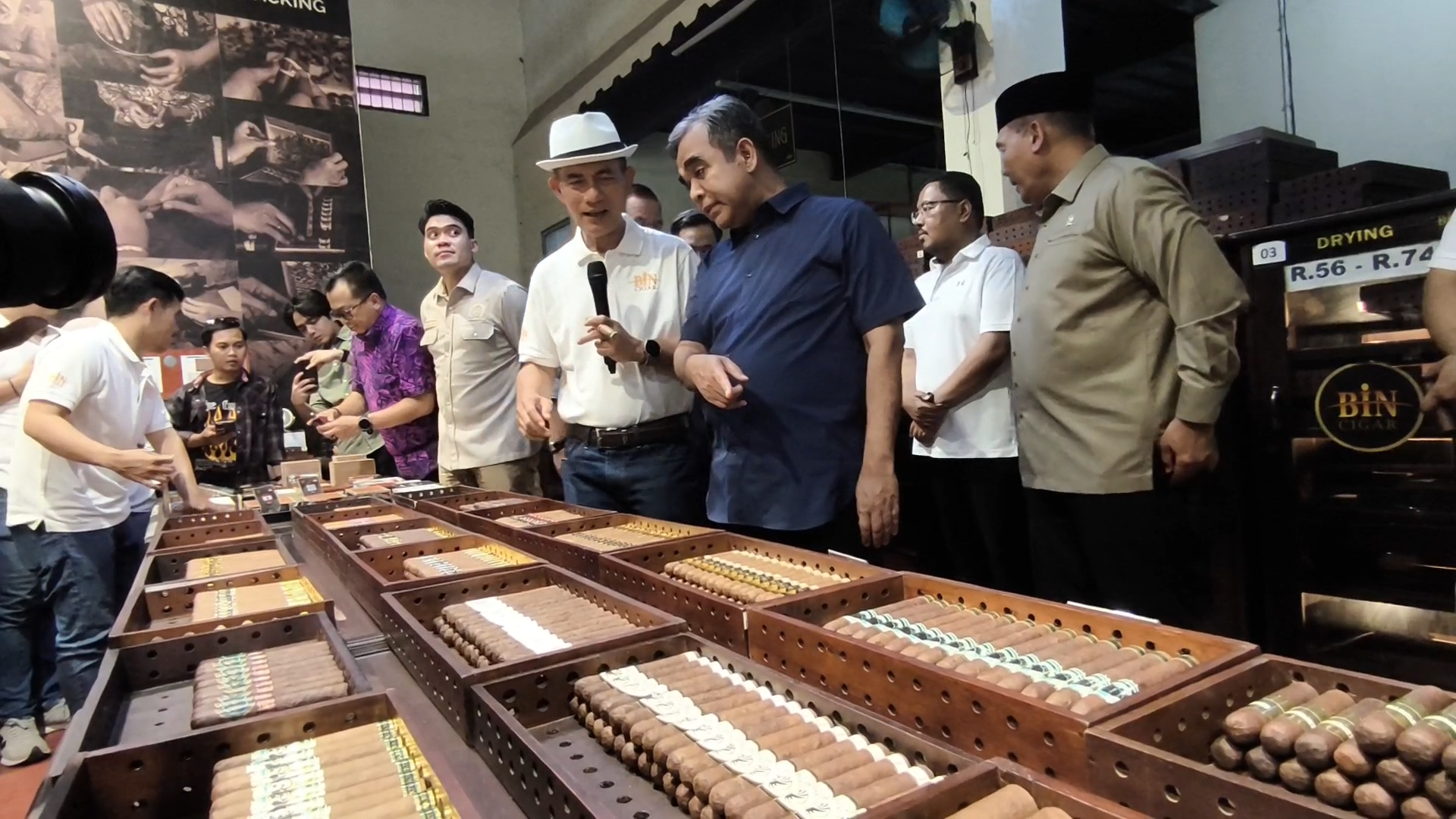 Dengan didampingi Bupati Jember Muhammad Fawait, Ahmad Muzani bersama rombongan mengunjungi pabrik BIN Cigar di Jalan Brawijaya, Desa Jubung, Kecamatan Sukorambi, Jember, Sabtu (1/11/2025). Dalam kunjungan tersebut, ia meninjau langsung proses produksi cerutu mulai dari pengeringan hingga pengemasan.
